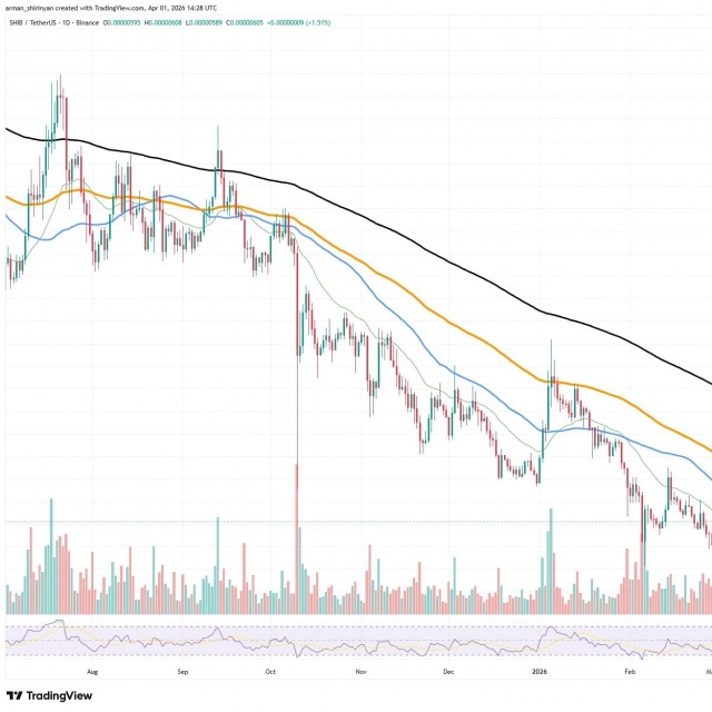 当前市场正经历从持续抛售向价格压缩与潜在突破阶段的过渡。在经历了数月高点下移与下降均线持续压制的困境后,SHIB开始构筑更高的低点。由此形成的收窄楔形结构中,价格正盘旋于局部阻力区下方。