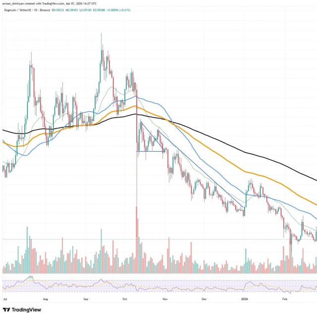 图表清晰显示,DOGE持续交投于所有关键均线下方。50日、100日及200日均线呈标准空头排列,形成典型熊市压制格局。