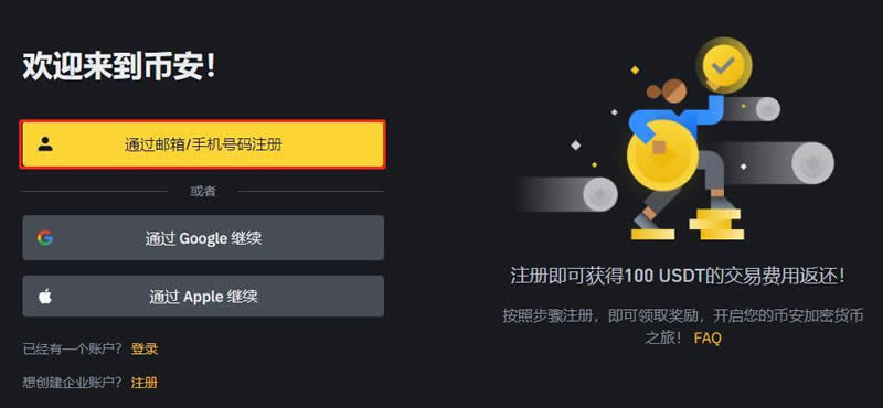 进入币安官方网站(),找到页面左侧的【使用邮箱/手机号注册】选项并点击。