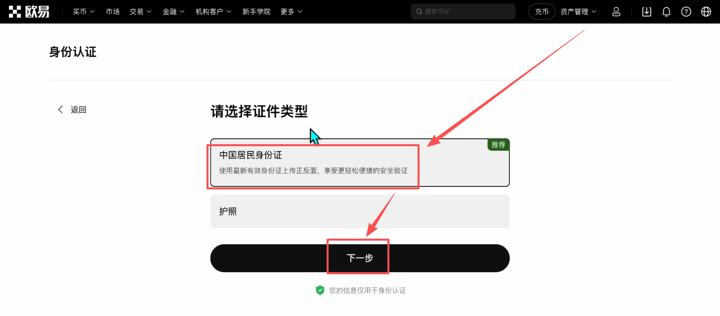 KYC认证包含证件上传与人脸识别两个核心环节,全程约5分钟即可完成。点击"立即认证"按钮进入流程,选择中国作为认证国家。