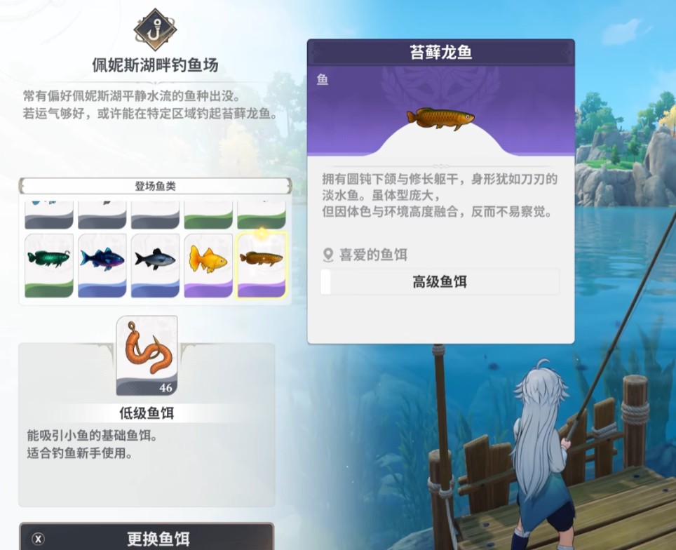 苔藓龙鱼大多隐伏在湖岸水草丛中与周围环境相融,需要钓鱼者仔细观察水面动静才能捕获目标。作为七龙鱼的一员,它并不是那种深海巨兽那样无法接近,但是它所处的独特栖息地位置却要求玩家要先打开佩妮斯湖畔的传送点或者徒步穿过复杂的林地地形才能到达。