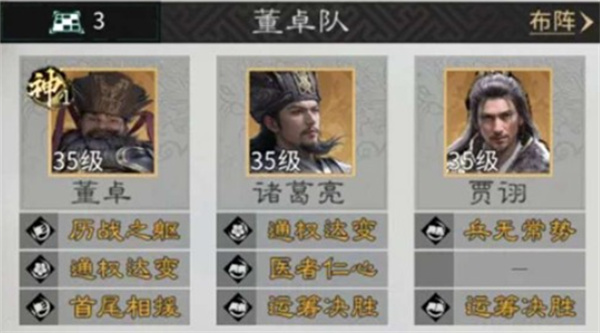 董卓的主动技能“独断专权”是阵容的起手控制。这个技能可以强制转移我方全体的统率值到董卓自己身上,同时随机对三名敌方单位施加挑衅和异常状态,比如技穷或牵制。这个效果与贾诩的技能形成了第一层控制闭环。当被挑衅的目标受到贾诩“纵傀”技能影响时,触发混乱的概率会显著提升。诸葛亮的“料敌机先”则构成了第二重加速引擎,每回合可以叠加层数,在敌方释放技能时触发智力比拼,成功后不仅能造成伤害,还能附加技穷或牵制效果。