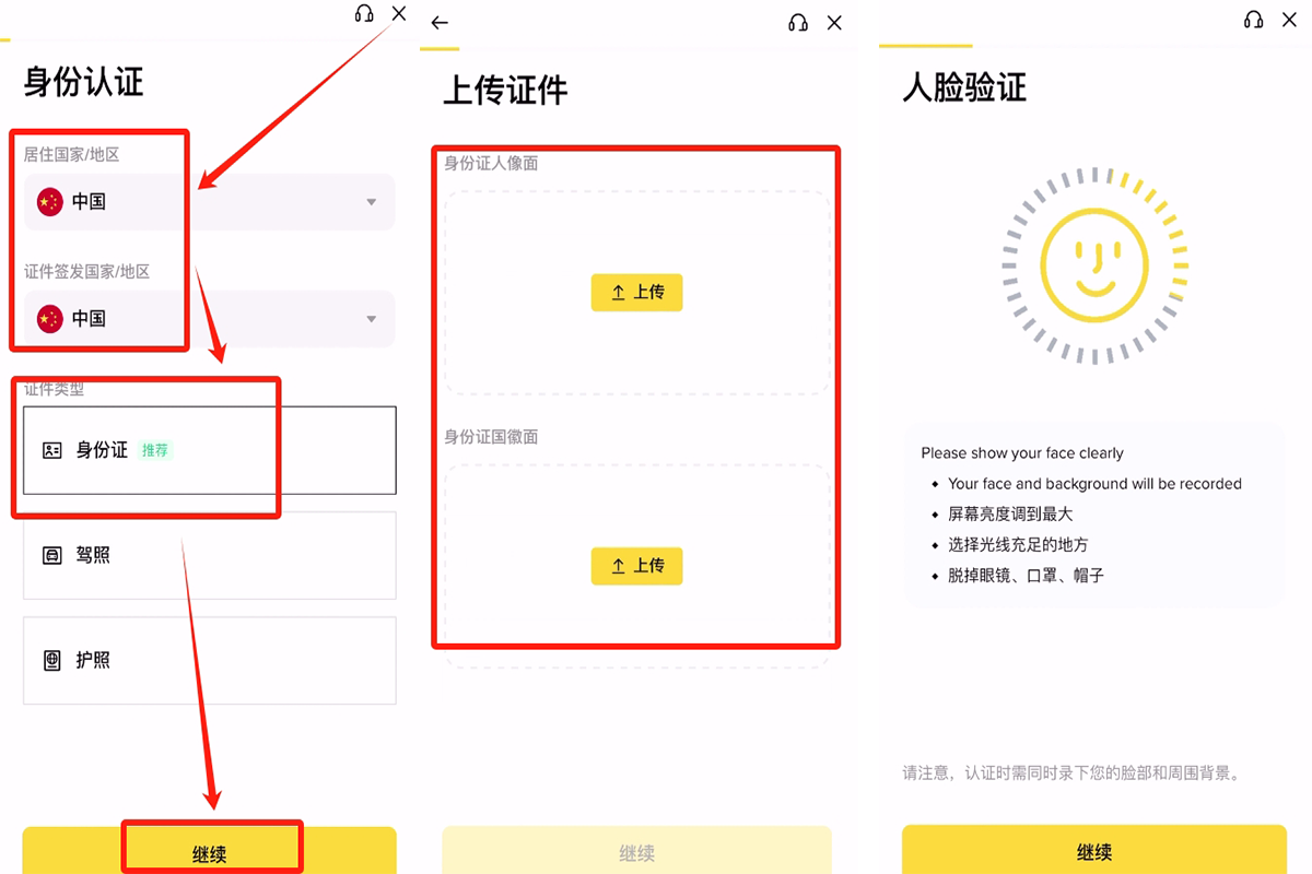 认证时选择中国地区,填写与证件一致的地址。上传身份证照片并完成人脸识别,审核通常5-10分钟。