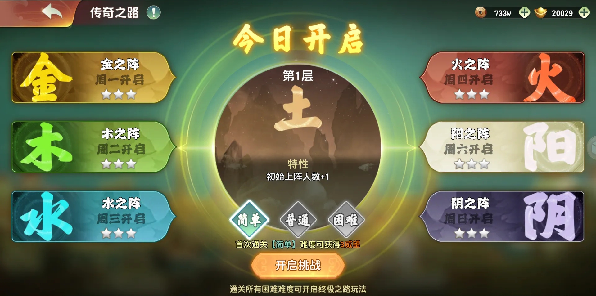 “传奇之路”每周开放六天(周一至周四、周六、周日),周五暂停开放。每日对应一种专属阵法主题,按顺序循环为:金、木、水、火、阳、阴。每种阵法均内置独特机制,例如属性增益、回合限制、特殊减益或羁绊加成等,需针对性调整阵容应对。难度采用阶梯式解锁模式——当玩家成功通关某日当前难度后,次周同一日期将自动开放更高一级难度。需注意:每日仅可挑战一次,重复通关不发放额外奖励。