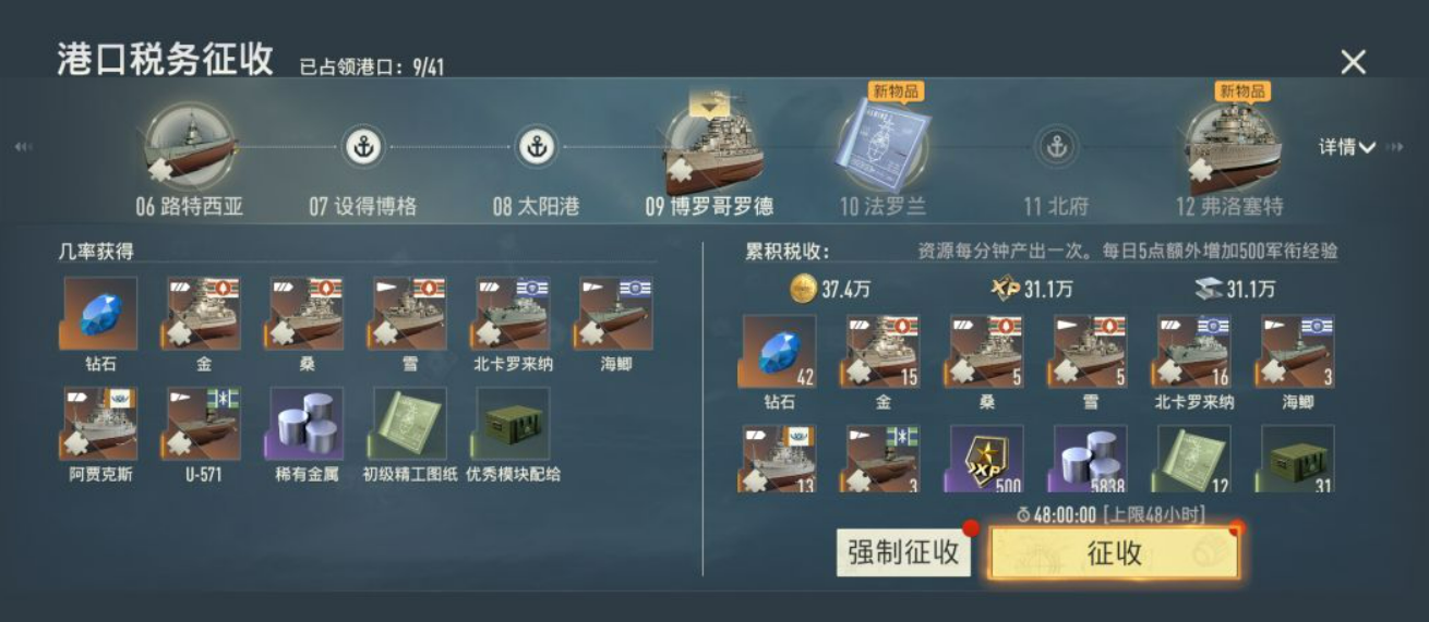 港口税收是全游戏中最基础、最稳定的被动收益来源。完成主线章节即可解锁新港口,每座港口按固定周期自动产出 币、铁块及稀有金属。随着占领数量增加,单次征收总量同步提升;同时,对已占领港口进行升级,可直接提高单位时间产量。需注意的是,各资源存在存储上限,闲置过久将导致溢出损失。建议养成每4–6小时登录收取一次的习惯,确保产能不浪费。