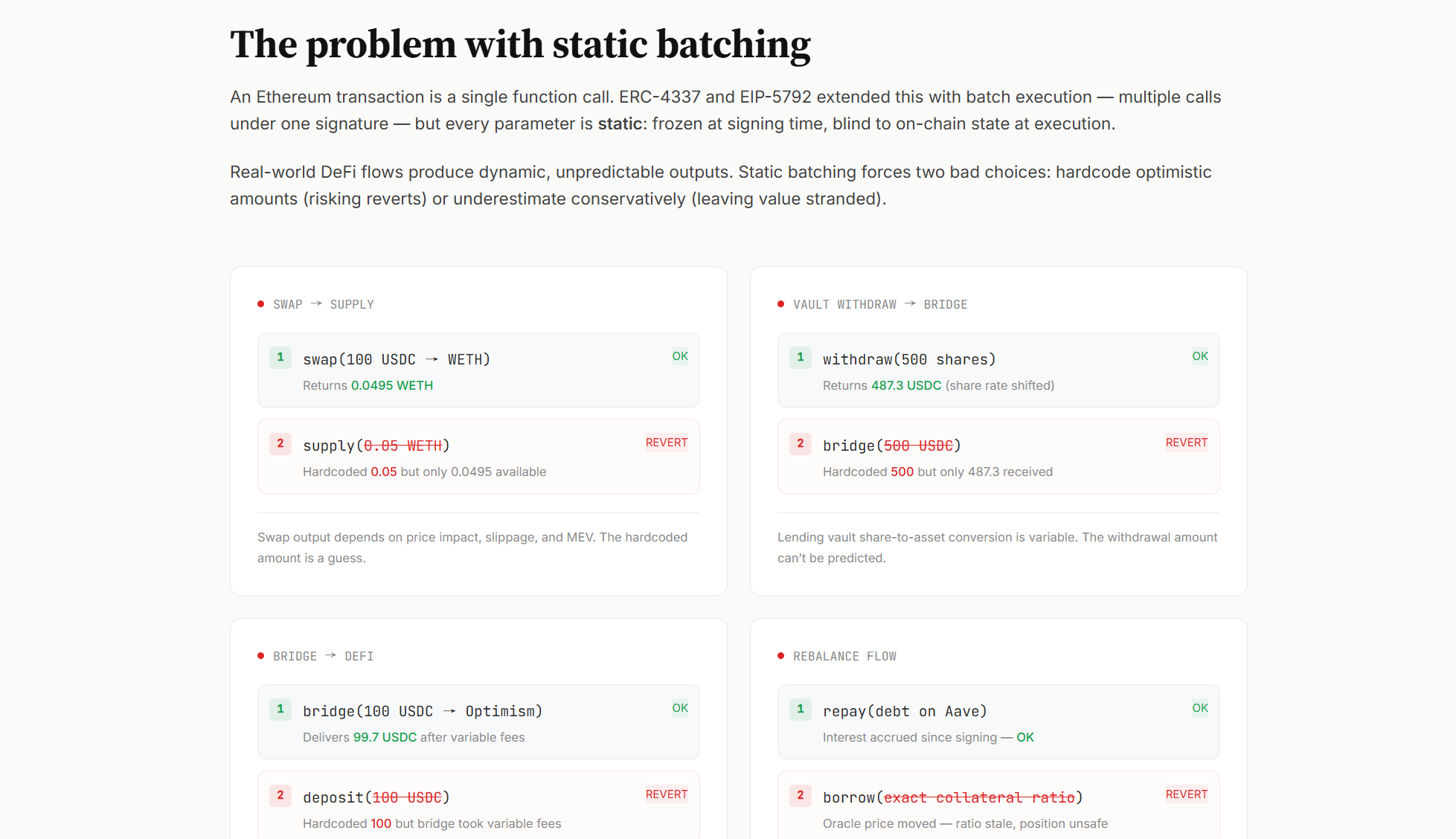 真要落到生产环境,这一短板可以概括成一句话:DeFi 是动态的,但今天的大多数 batch(批处理) 仍然是静态的。