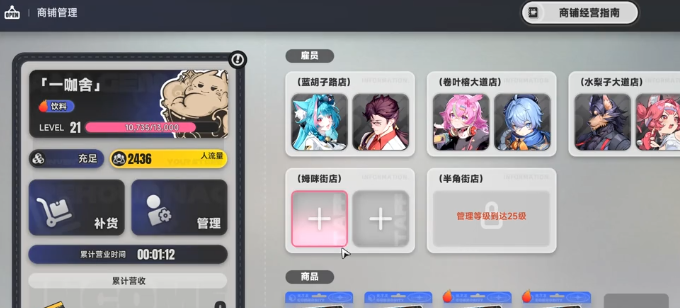 首日发展重心必须锁定店铺系统。务必优先推进主线进度,尽快解锁咖啡店经营权限——这是全游戏中最稳定、可持续的金币来源。店铺升级经验与实时收益提取量严格挂钩:单次提取金额越高,所获经验越多。因此建议养成定时查看收益的习惯,一旦达到升级阈值立即执行提取,并同步更换为高单价商品组合,大幅提升升级效率。持续获得金币后,可立即投入“店长特工1-1”副本刷取,单次通关仅需数十秒,稳定产出1200万金币,是前期快速积累资本的核心手段。