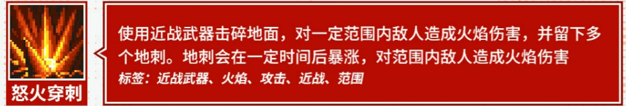 “怒火穿刺”具备延迟判定特性:持械猛击地面,生成数根潜伏地刺;短暂延迟后,地刺骤然爆起,对周围敌人施加二次火焰伤害。该技能兼具控场与持续威胁能力,适用于狭窄地形或密集敌群环境,形成有效战术布防。