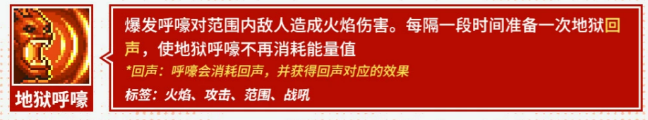 “地狱呼嚎”引入能量循环机制:首次释放造成范围火焰伤害,并开始积攒“地狱回声”;当回声满层后,再次释放本技能将不消耗能量。该设计强调节奏把控,鼓励玩家建立“蓄能—爆发”的稳定循环,避免无序释放导致资源枯竭。