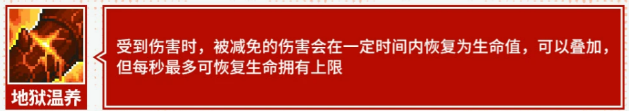 “地狱温养”提供间接续航支持:角色受到伤害时,所有被减伤效果抵消的部分,将在后续数秒内按比例转化为生命恢复;每秒恢复量设有上限,整体回血效率与减伤能力正相关,强化生存构建策略的多样性。