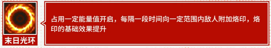 光环技能“末日光环”为常驻压制技:开启后持续消耗能量,周期性为目标附加烙印,并提升烙印基础效果(如持续时间、伤害加成等);与“拷问”被动协同作用,可显著延长烙印覆盖率与层数上限,大幅增强群体压制强度。