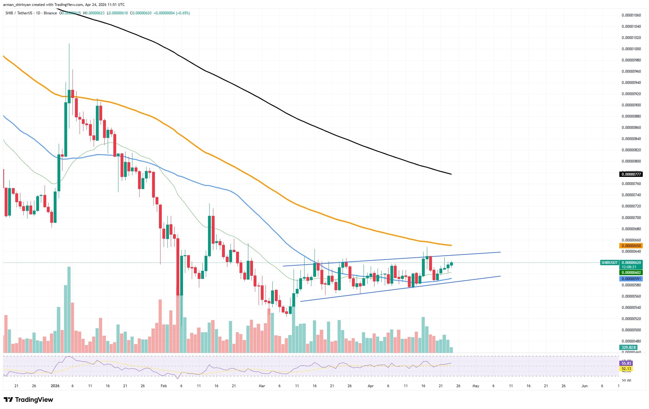 经历长期下跌趋势后,SHIB在价格图表上正构筑温和上升通道。尽管更长时间框架的移动平均线(尤其是100日和200日EMA)仍呈下降趋势,这仍是积极进展。除非出现放量突破,否则上行动能将受限。