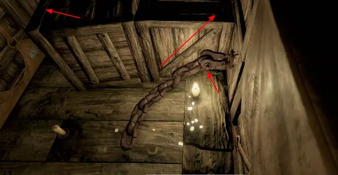2、沿着此处铁链跳上去,上面有一根蜡烛,然后斜对面隐藏有一根蜡烛