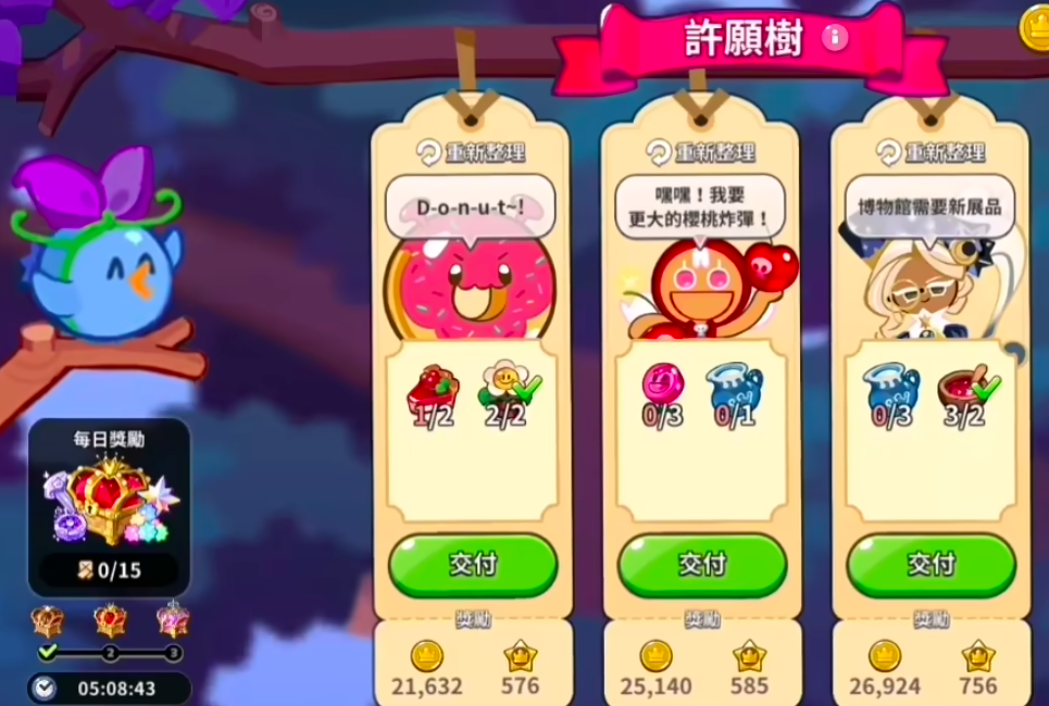 另一条核心获取路径为许愿树兑换系统。玩家在地图中与蓝莓鸟发生接触后,点击即可跳转至许愿树界面。在此界面中,需根据蓝莓鸟发布的订单要求提交对应材料,完成交付后即可领取专属宝箱。当前许愿书所列可兑换物资包括草莓酱、牛奶、樱桃棒棒糖、幸福花等固定品类,每项订单均对应唯一宝箱奖励,且不设重复领取限制。