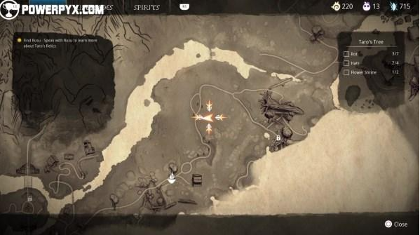此收集品需要留守山弓箭(剧情解锁)。在与腐化的太郎战斗的同一片区域中,找到一根可以走上去的倒下的枯木,抬头看可以找到一朵能抓的花,爬上岩壁并沿着台子一直往后走,差不多到达由高大树木组成的森林的起点,腐灵就在灯笼下面。