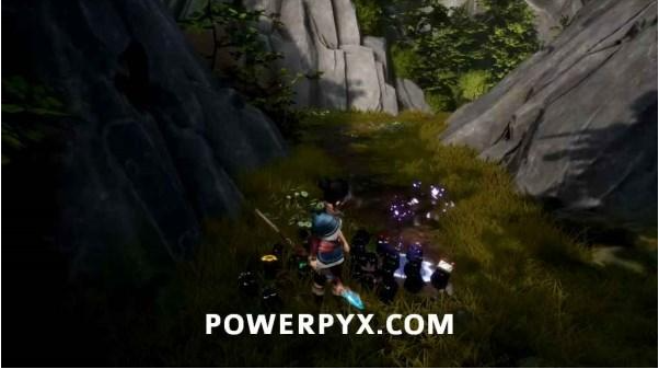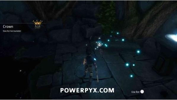 获得上面一个腐灵帽后沿路继续走,一直到看见一个旋转的石头雕像(激活大门),旁边有往上走的楼梯,走到尽头炸开岩石打开通路。进入新区域后可以看到射击挑战,注意看地面上发光的紫色图标指示(按L1脉冲开始挑战)。在所有飞行目标落地之前击中他们即可获得这个腐灵。